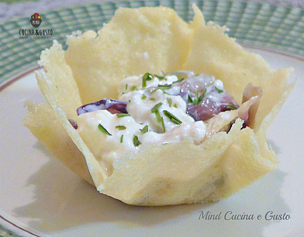 Un antipasto semplice da preparare e perfetto per aprire un pranzo di ricorrenza che sarà gradito ai vostri ospiti. Con questa ricetta puoi dare sfogo a tutta la tua fantasia. Il cestino può essere riempito con quanto più si preferisce. Con verdure pesce o frutta e da non escludere salumi e abbinamenti che oggi si possono osare. Io ho usato il radicchio e la  crescenza insaporendo con erba cipollina. Il sapore amarognolo del radicchio e la crescenza si fondono in un connubio di sapori irresistibili in questi Cestini parmigiano e radicchio Sono buonissimi. Vieni a vedere come procedere per prepararli.