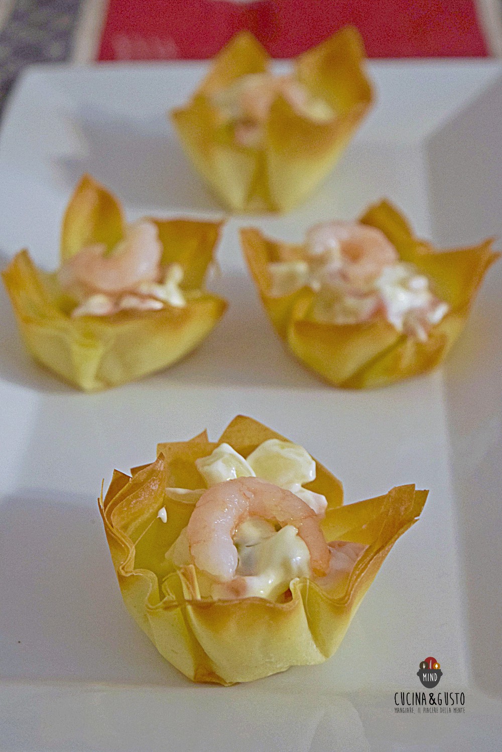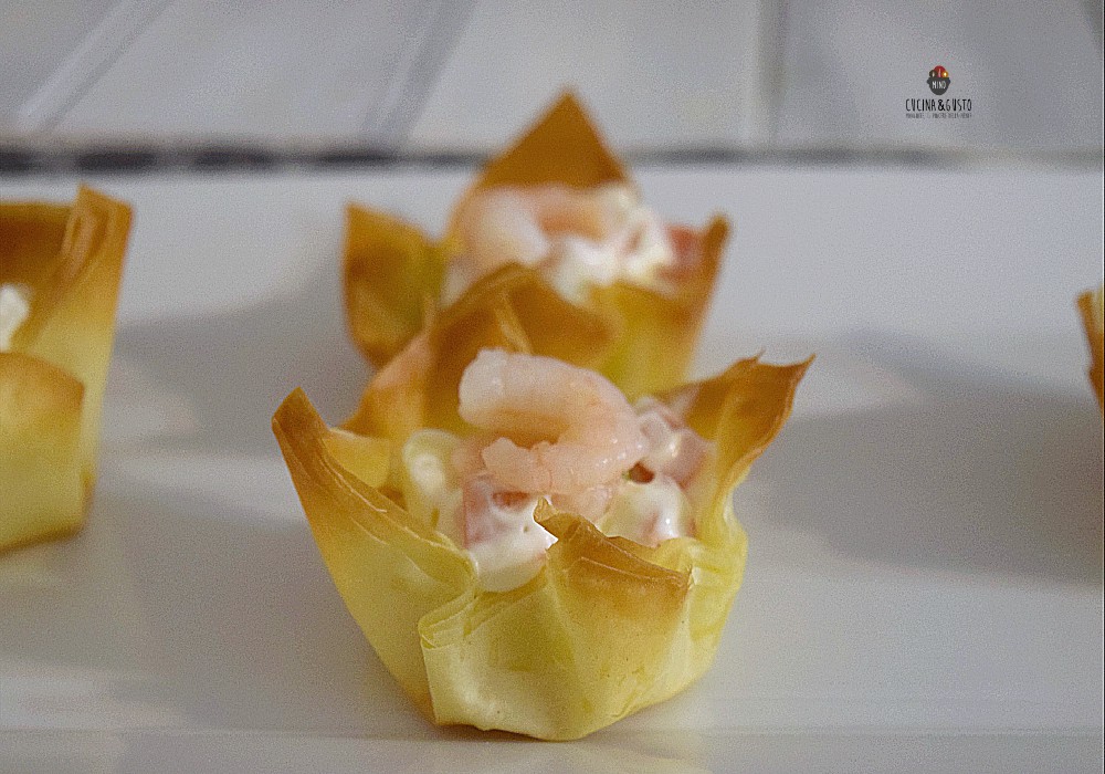 I Cestini di pasta fillo con insalata russa e gamberetti sono un antipasto facile da preparare e davvero sfizioso. La pasta fillo è davvero versatile, facile da utilizzare, si presta per diverse preparazioni sia dolci che salate in particolare per i finger food da aperitivo. Questa pasta è composta soltanto da acqua e farina e va leggermente unta per essere ben maneggiata e tirata evitando così di romperla. Questi piccoli backet li ho portati in tavola per la vigilia e ho ripetuto anche per il pranzo di Natale, così croccanti, golosi e chic. Sono appetitosi, adatti da realizzare e proporre per le tavole delle feste, buffet e ricorrenze. Insomma in ogni occasione questi cestini sono perfetti. Basta avere un rotolo di pasta fillo e il gioco è fatto. Andiamo a vedere la ricetta.