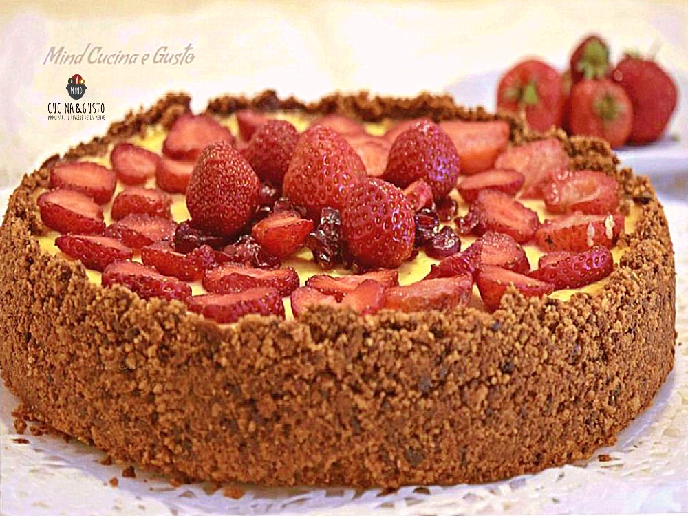 - Togliere lo stampo dal frigorifero e versare la crema ottenuta nel guscio biscotto e infornare a 160° per circa 55/60 minuti. Appena pronta toglierla dal forno e lasciarla raffreddare e poi metterla in frigorifero per 3 ore prima di toglierla dallo stampo. Nel frattempo lavare bene le fragole e tagliarle a fettine sottili. Lasciarne da parte alcune intere per la decorazione.