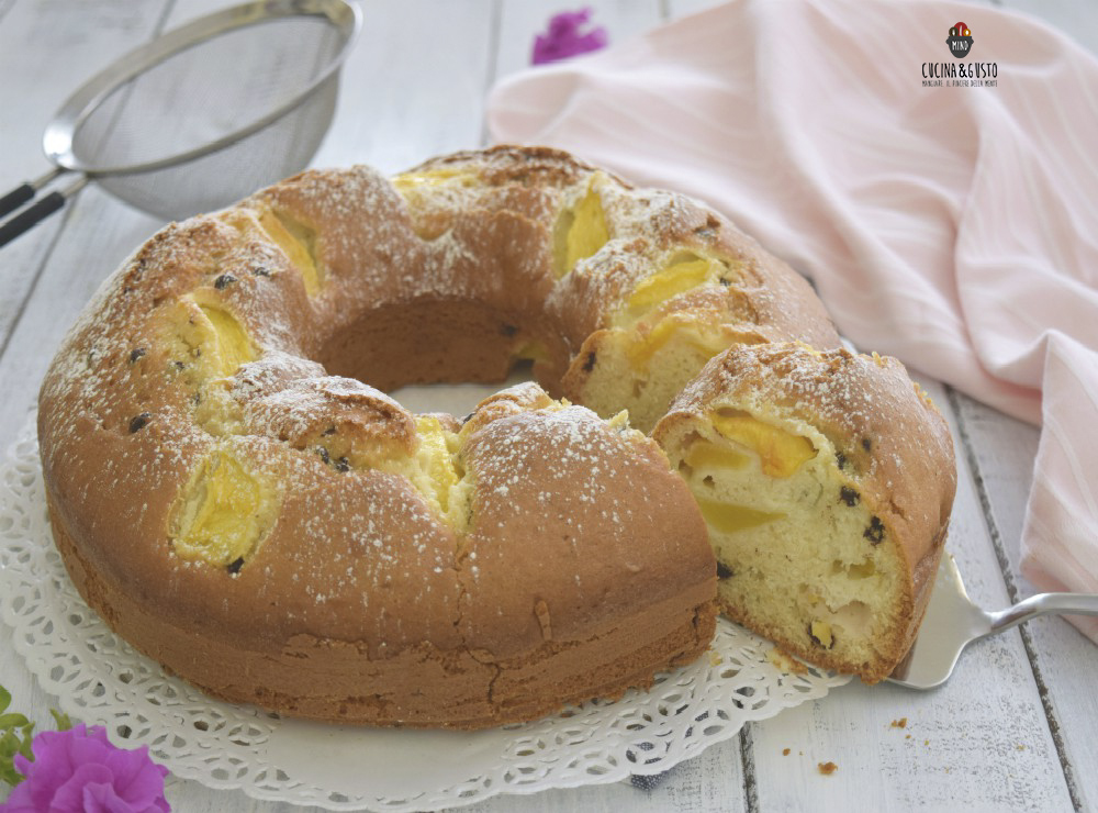 Adoro preparare i dolci con la frutta e il Ciambellone alle pesche e gocce di cioccolato senza burro è ancora più goloso con le pesche noci e le gocce di cioccolato. Leggero perché senza burro.