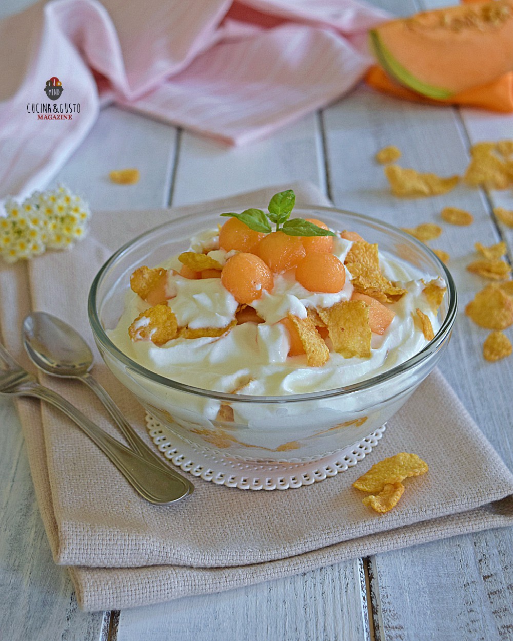 Coppa con crema di yogurt melone e cornflakes