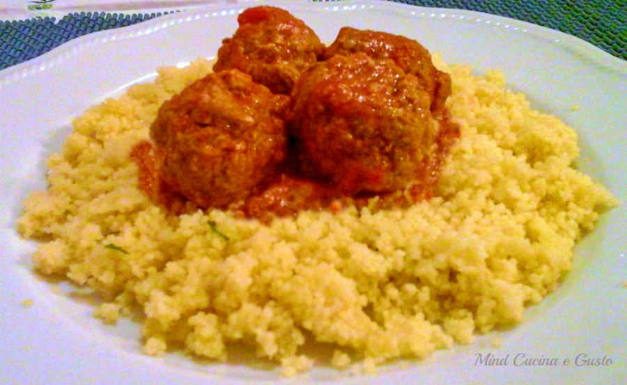 Impiattare il cous cous adagiando sopra sopra le polpettine e condire con il sugo.