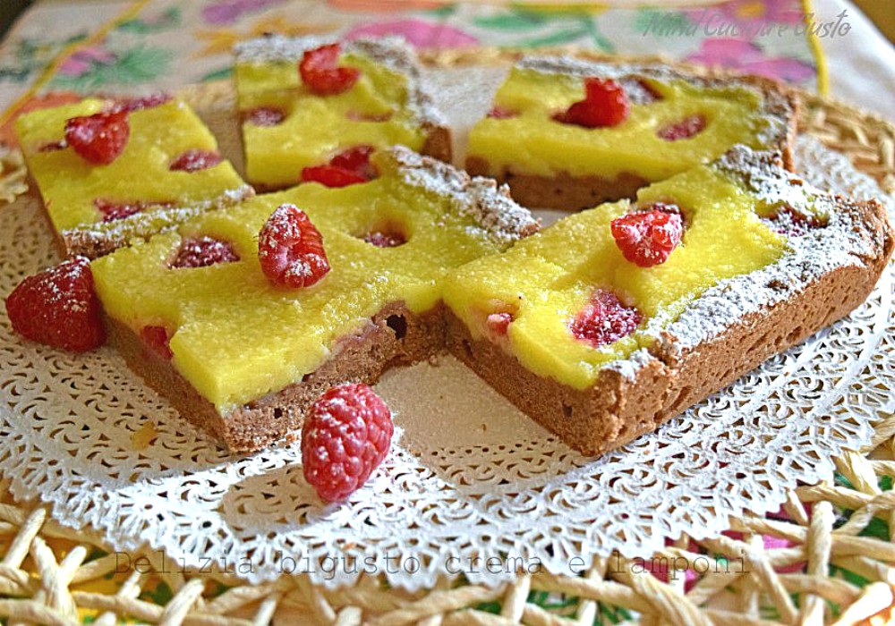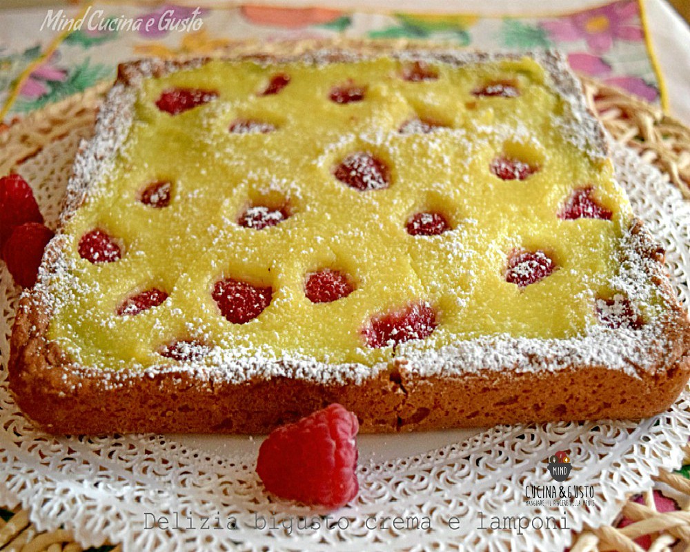 La Torta delizia bigusto crema e lamponi è una torta buonissima. Semplice e golosa. Un dolce facile da preparare e ricco di dolcezza e morbidezza. L’abbinamento tra crema e lamponi è vincente in assoluto, l’equilibrio tra la dolcezza della crema e il sapore frizzante e aspro dei lamponi dona a questo dolce un gusto avvolgente e un fascino particolare. Provate questa delizia e resterete appagati dalla sua bontà!