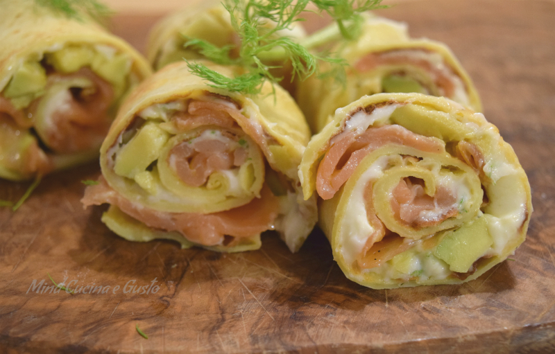 - Spalmalo sulla superficie delle crépes e cospargi con i dadini di avocado e infine con le fettine di salmone affumicato.