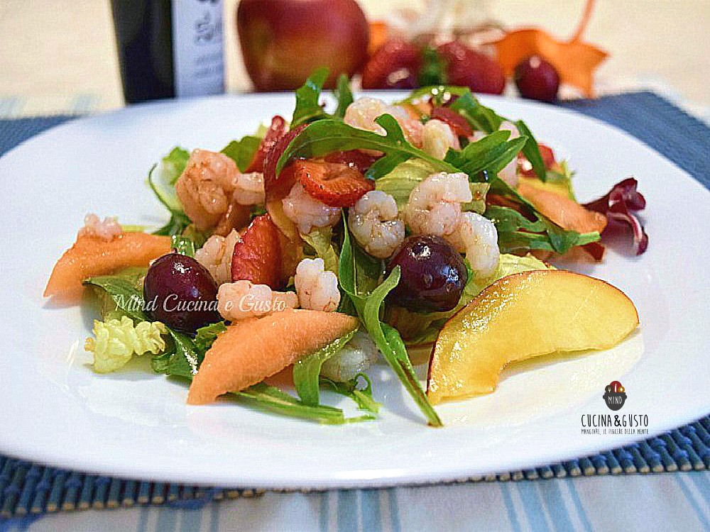 Ed ecco oggi ve la presento. Con le fragole, le ciliege, il melone e la pesca che abbinate alla rughetta, ai gamberi e ad una fresca insalata mista, danno vita ad una esplosione di sapori contrastanti fra il dolce e il salato, il tutto condito con alcune gocce di aceto balsamico. Insomma una ricetta all’insegna dell’estate e della nostra mediterraneità