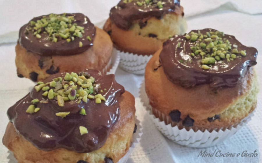 - Appena pronti i muffin lasciarli raffreddare e poi con l’aiuto di una sac a poche con la bocchetta liscia, distribuire la glassa di cioccolato sulla superficie dei muffin e decorare subito con la granella di pistacchi.