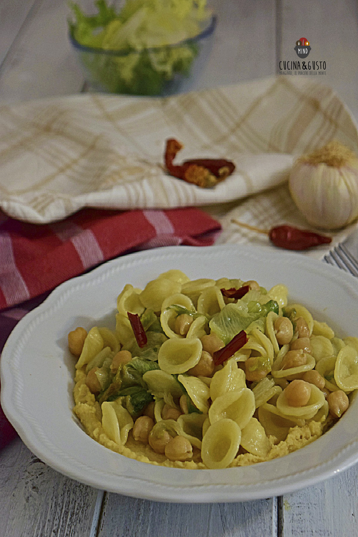 - Metti nei piatti di portata le crema di ceci, aggiungi le orecchiette decorando con qualche foglia di scarola e peperoncino.