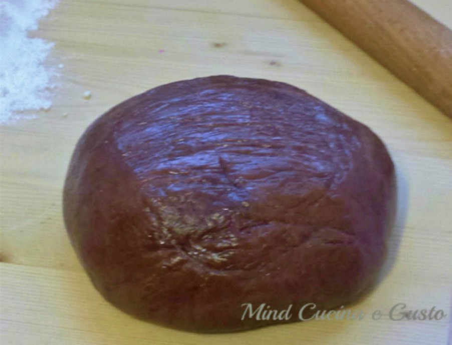 Posizionare il composto su un piano di lavoro e unire il cacao setacciato e lo zucchero a velo. Una volta mescolato insieme, formare la fontana e all’interno unire i tuorli.