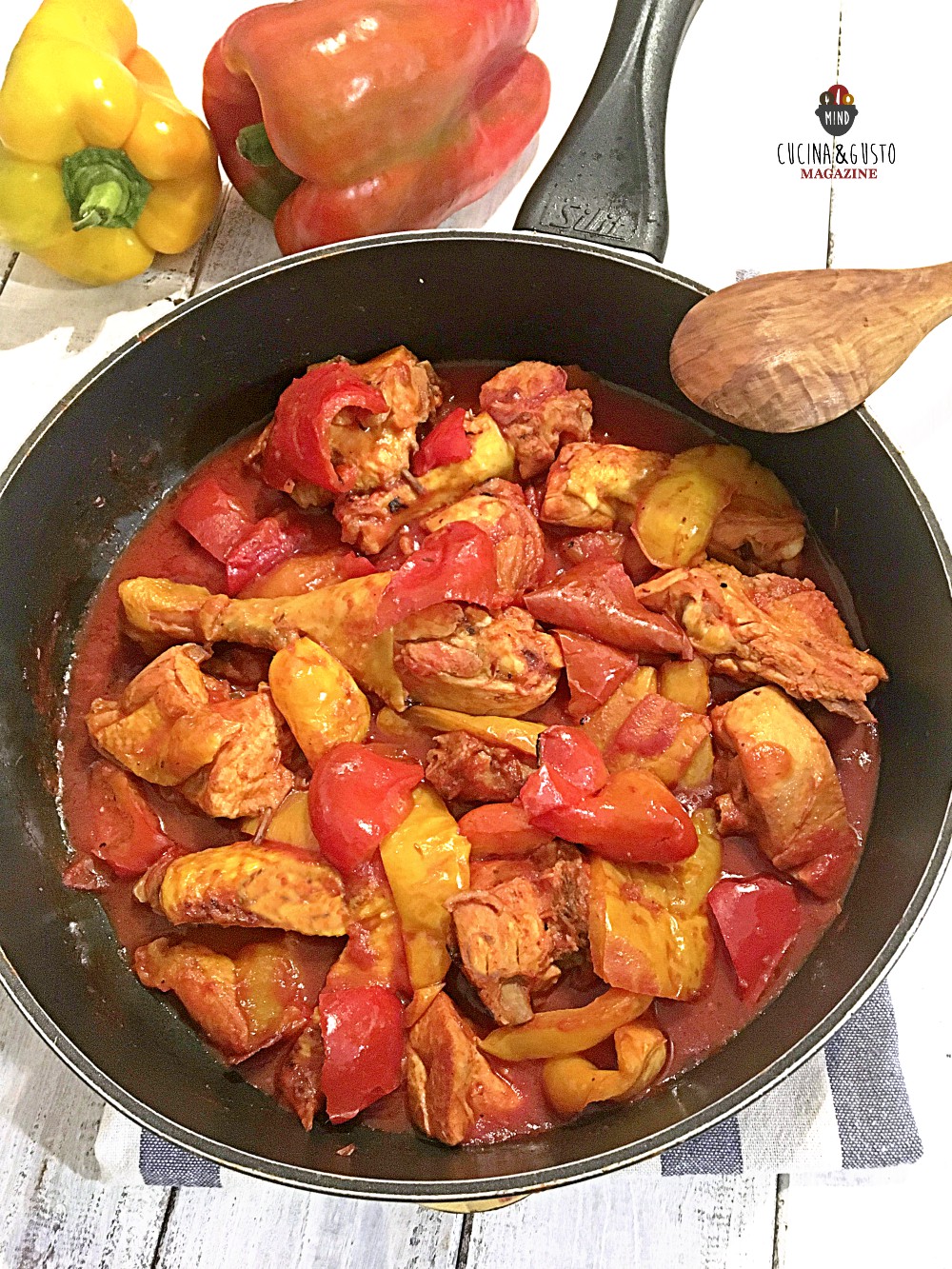 - Nella ricetta della Sora Lella, la cottura dei peperoni viene fatta a parte. Io ho seguito la ricetta che mi ha detto mio marito, come lo prepara mia suocera di cuocere i peperoni insieme con il pollo. Mi ha spiegato che il liquido dei pomodori e dei peperoni permette una cottura migliore del pollo .