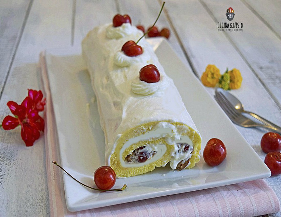 Il Rotolo con panna e ciliegie è un dolce goloso e delicato facilissimo da preparare. Fresco e delizioso, è particolarmente indicato da realizzare durante la stagione estiva. E’ composto da una semplice pasta biscotto soffice e morbida con panna e ciliegie fresche, che in questo periodo sono davvero dolci e buonissime. Queste in particolar modo che ho usato, sono davvero a chilometro zero. Un regalo di Giuse, il portiere del mio stabile, che mi ha fatto una gradita sorpresa con queste primizie appena colte dall’albero del suo giardino. Insomma un dolce da provare e gustare assolutamente. Vediamo subito la ricetta.