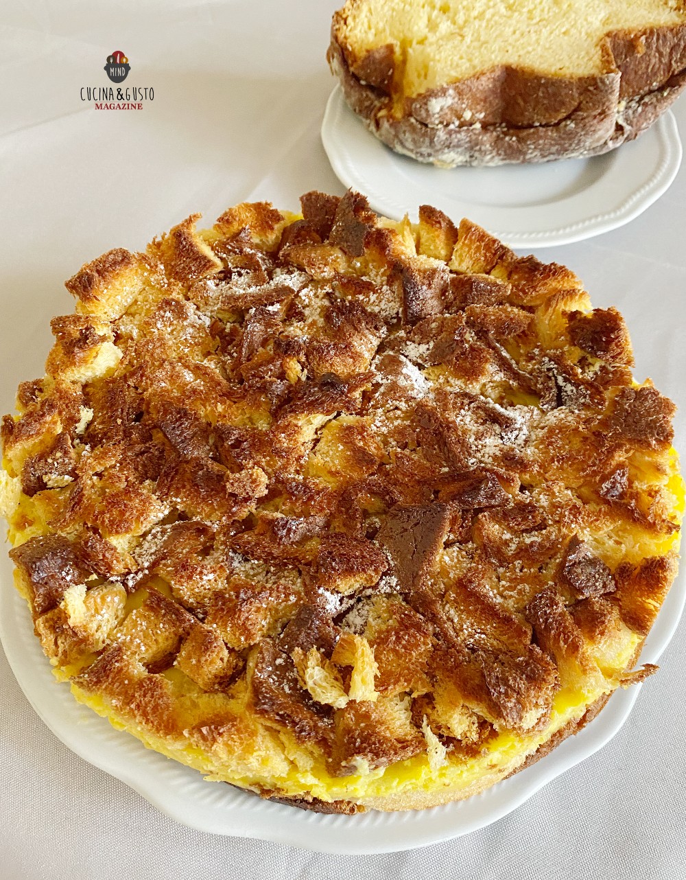 Basta avere degli avanzi di pandoro, ne occorrono anche poche fette, metterli in una teglia schiacciando bene e poi farcire con crema pasticcera e infine decorare con i ritagli di pandoro tagliati a dadini piccoli ed una spolverata di zucchero a velo. Dunque un dessert d’effetto, da preparare anche all’ultimo minuto. Con pochi minuti di cottura in forno e si formerà una crosticina croccante con all’interno un irresistibile cuore cremoso.