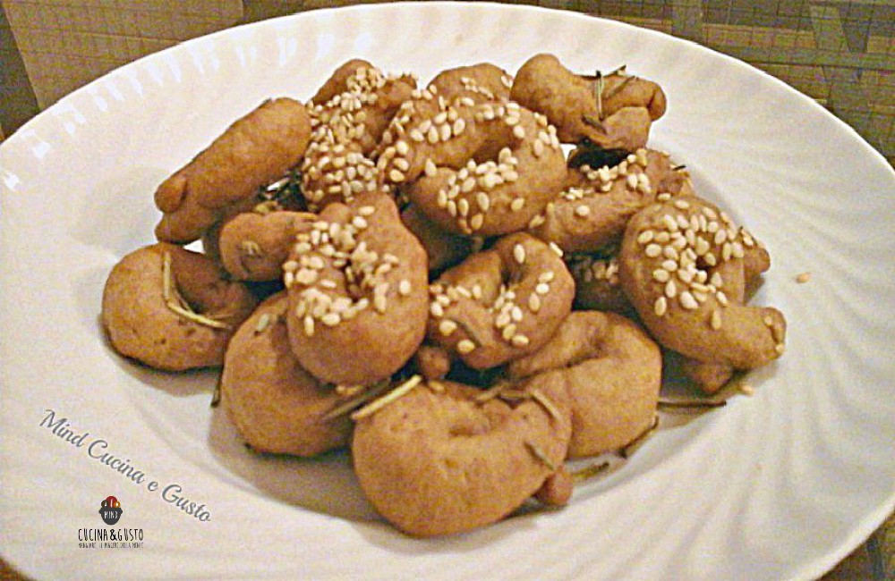 A chi non piaccioni i tarallucci alzi la mano io li adoro e oggi li ho preparati così Tarallucci al sesamo e rosmarino, sono irresistibili. Stuzzicanti e golosi. Ormai li troviamo facilmente e per tutti i gusti in vendita ovunque ma preparali in casa è tutta un’altra cosa. Hanno un sapore e una friabilità incredibili. SI possono preparare in quantità abbondanti, resteranno ben mantenuti a lungo. Li ho preparati con l’impasto della pizza di scarola e sono venuti benissimo. Sono ideali per un aperitivo oppure da sgranocchiare prima di una cena con ospiti oppure in casa nel pomeriggio o davanti alla tv. Accompagni da un buon vino bianco frizzante sono super!