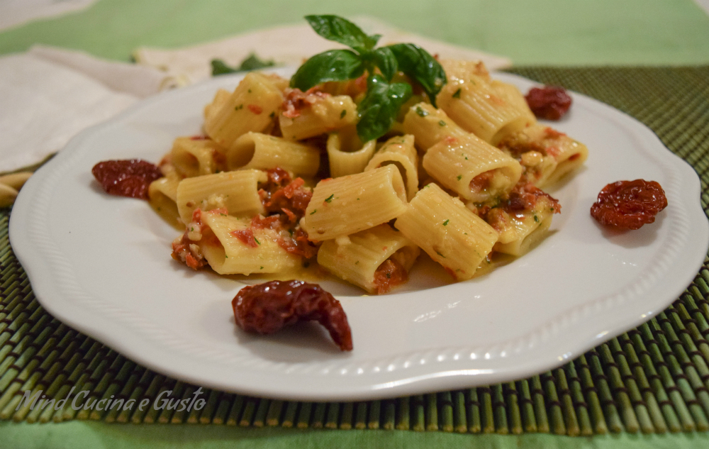 Prima di salutarci Pietro mi ha omaggiato di alcune bottiglie di qeusto buonissimo olio con il quale ho voluto creare una mia ricetta, le mezze maniche con pesto di mandorle e pomodori secchi.