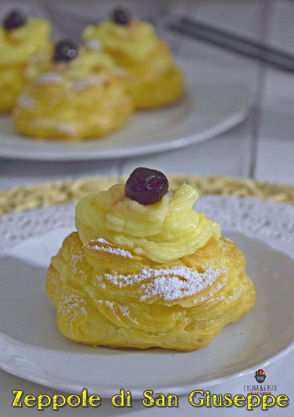 Apri in due le zeppole con un coltello affilato, farcisci all’interno con la crema, ricopri con il coperchio della zeppola, passa un giro di crema sulla superficie e guarnisci con l’amarena sciroppata, spolverando con lo zucchero a velo.
