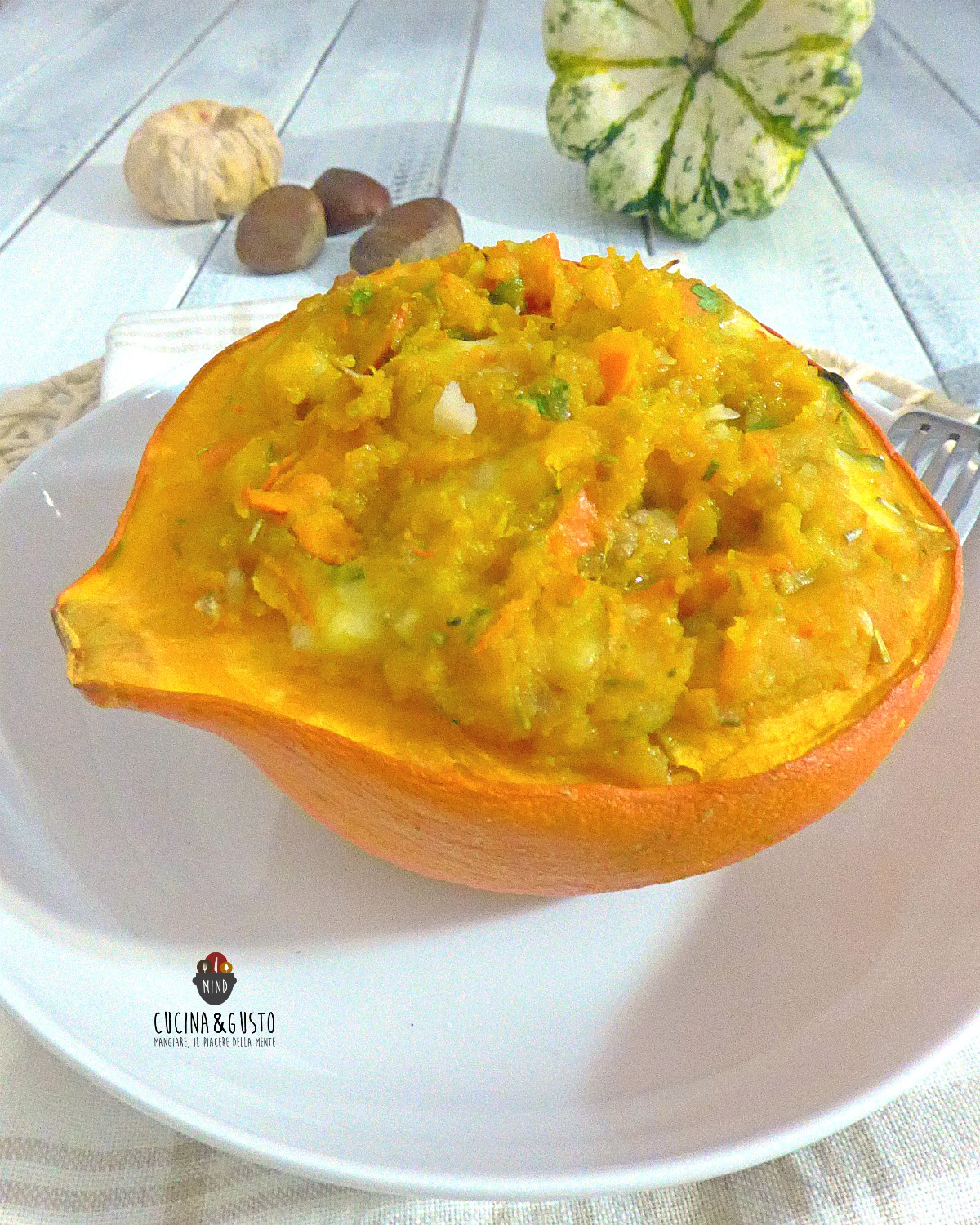 Per caso al mercato qualche giorno fa l’ho trovata sul banco e non ho resistito a prenderla. Livia che conosco ormai da tanto e che si informa sempre del mio blog, mi ha parlato di quanto la sua consistenza e sapore fosse differente dalla comune zucca e che in cottura è buona anche la buccia, insomma non si butta via nulla. Per esaltarne la bontà prepararla ripiena è davvero speciale e I modi sono molteplici , usando gli ingredienti che ognuno preferisce. Questa è una versione vegetariana, con la polpa della zucca, formaggio e castagne, una delizia ai profumi dell’autunno.