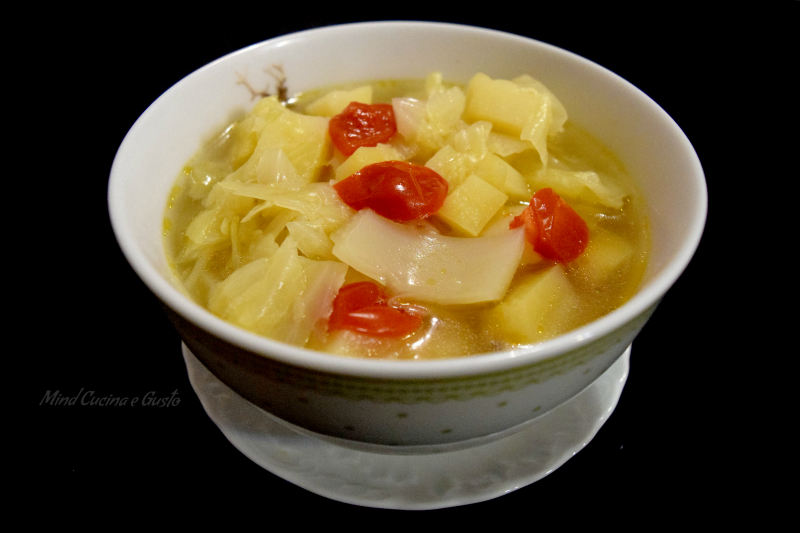 Appena passati qualche minuto e le verdure saranno imbiondite leggermente, togliere l’aglio e aggiungere la verza precedentemente tagliata. Unire anche le patate a pezzi e i pomodorini tagliati in quattro.