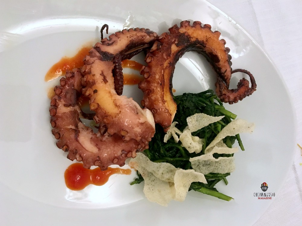 Il polpo scottato con confettura di peperoni e peperoncino con cicoria e Chips di riso, un modo originale e gustoso di proporre un antipasto di mare per chi gradisce il pesce e vuole gustarlo in tutta la sua freschezza.