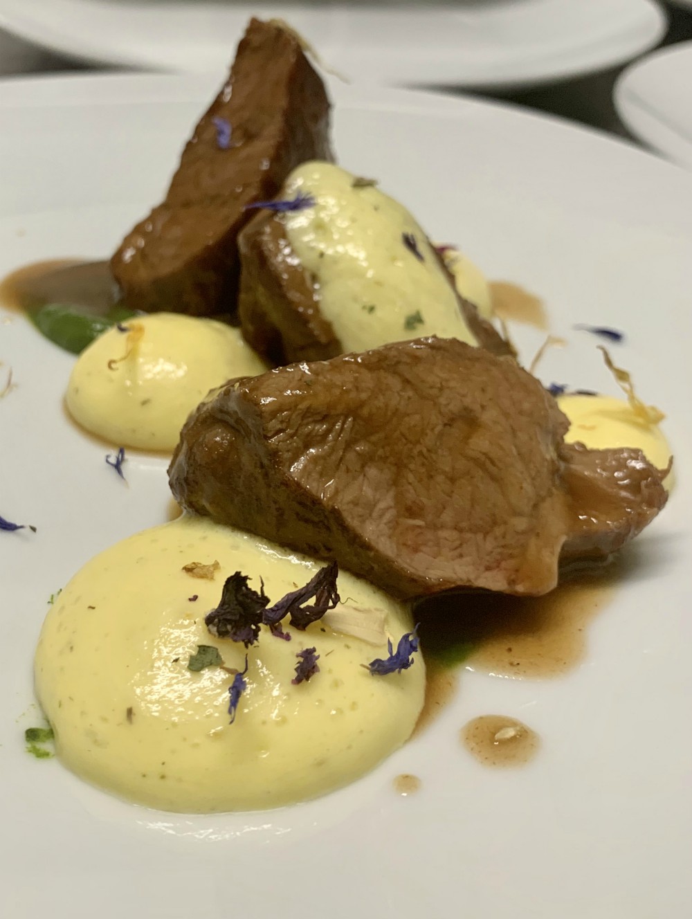 Il Sentiero Erboso un secondo a base di agnello, spuma di cacio e ovo, cicoria e patate, una rivisitazione del tipico piatto abruzzese Agnello cacio e ovo, realizzato in modo magistrale.