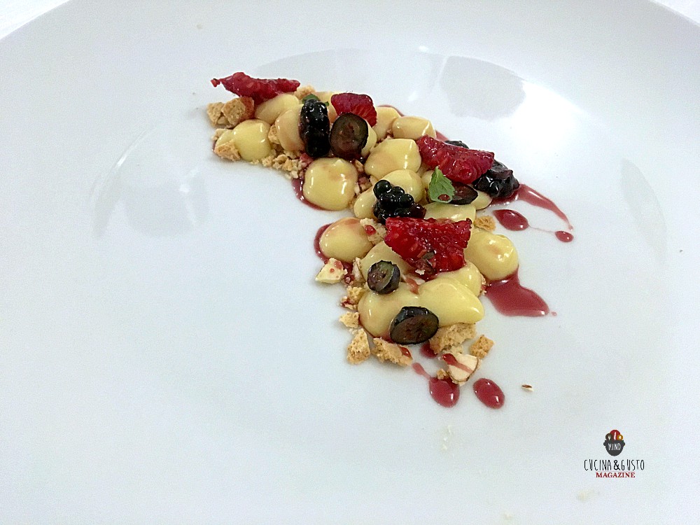 Per terminare il pranzo con una soave dolcezza, il Tratturo, un crumble di Cantucci alle mandorle, crema pasticcera lavanda e arancia, con frutti di bosco e riduzione di Montepulciano. Il dessert ispirato alla transumanza che Jones ha creato, pensando al percorso che i pastori facevano dall’Abruzzo fino al Tavoliere delle Puglie.